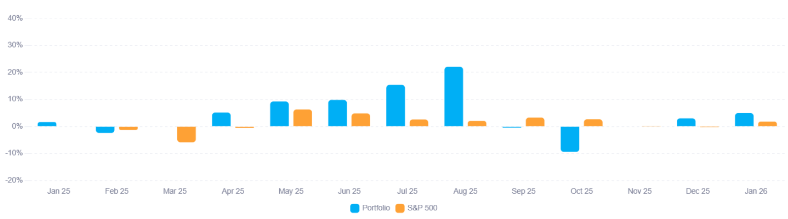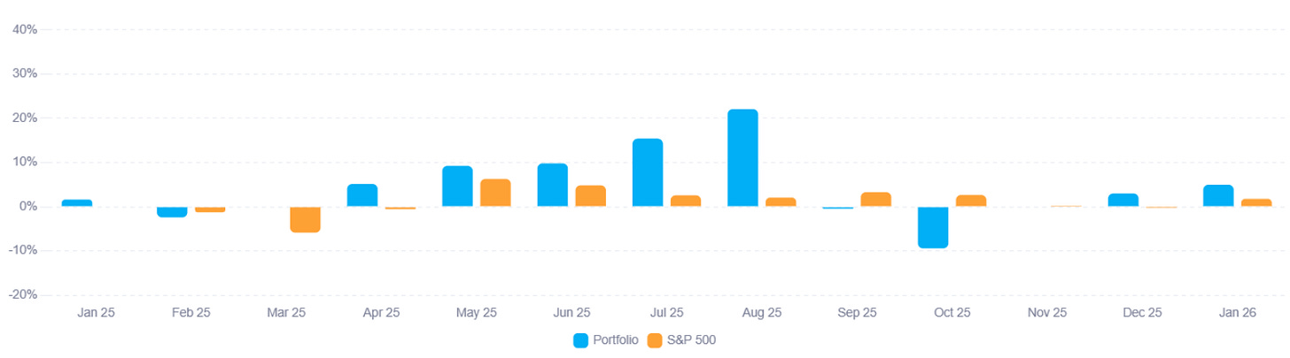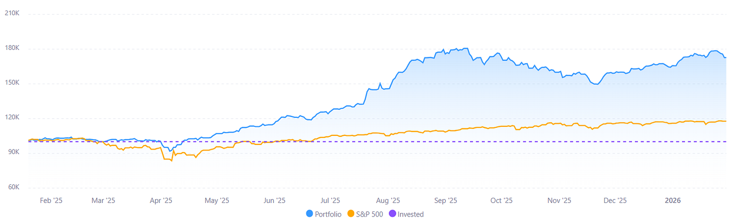 The Buried Bargains portfolio is up 72.53% since its inception on 20 January 2025. Returns for 2025 were 64.3%, and YTD returns so far are 4.96%. This means we are beating the S&P by 56.12%, while running at lower absolute risk than the market. We use no leverage and hold only cheap stocks with low expectations baked in—effectively reducing the most important risk: permanent loss of capital.